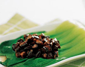 2、将香菇用温水浸软,去蒂洗净、入锅内、炒香菇,加入绍酒;生抽、糖少许,炒匀,用生粉勾芡。