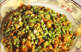 主料:豇豆300克,北豆腐250克,瘦猪肉150克,