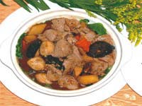 5、烹调:炒锅烧烫后用油滑锅,倒出锅内余油(滑油的目的是为了不使肉丁粘锅),随即投入肉丁速炒。