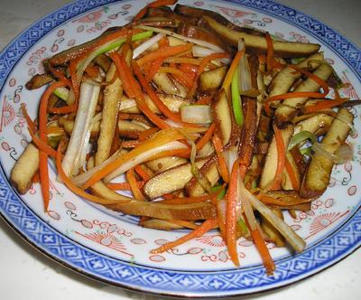 香干1盒(约7片)切丝,胡萝卜小半根切丝,葱丝随意,生抽1茶匙,黄酒1茶匙