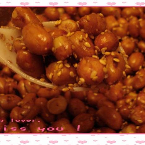 5、出锅啰~~~~~可不能把锅里多余的油也盛出来呀~~~~马上洒上适量盐和熟芝麻,晃动再晃动,看着这盐与芝麻都均匀的粘到花生米上,就ok了!