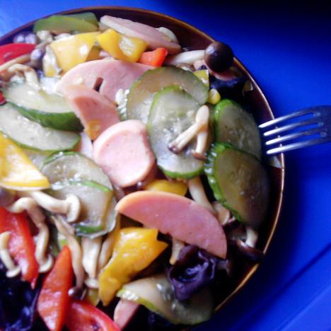 黄瓜一根,红黄彩椒各一个,木耳适量,蟹味菇适量,玉米肠一根,盐糖鸡精六月鲜酱油