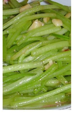 2.蒜切末,辣椒切断。先放入油中爆炒出香味,再下红薯藤。火旺,快炒,加少许料酒 炒至熟,用盐和鸡精调好味就可以出锅了。