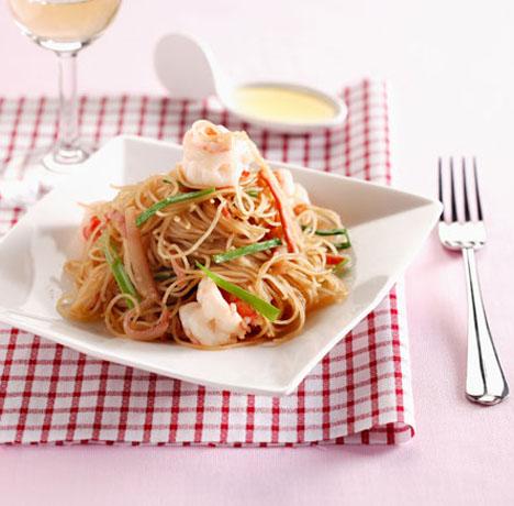 细米粉1/2包,火腿片2片,韭黄20公克,虾仁50公克,银芽30公克,青椒丝20公克,红椒丝10公克,洋葱丝40公克,蒜末1/2茶匙,水200㏄,蚝油1大匙,盐1/4茶匙,蕃茄酱1大匙,tobasco1茶匙,糖1茶匙,胡椒粉1/2匙