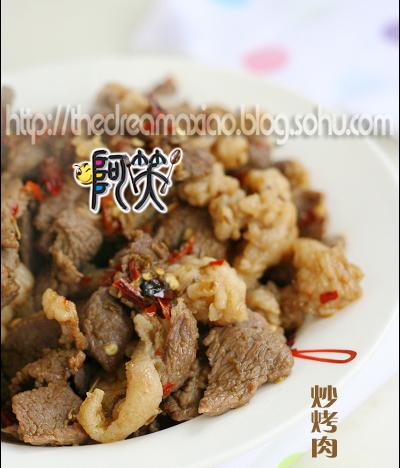 羊肉必须要干,炒的过程中一定要大火,时间要短,这样,羊肉才能有烧烤的味道,并且肉质鲜嫩~~