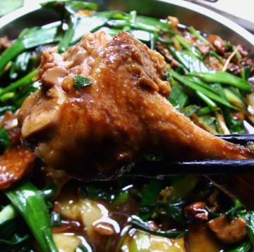 3、把之前炸过鸭的油和葁,蒜重新放进烧热的锅里,再次把鸭放进锅里翻炒一分钟,再把切段的蒜苗,蒜苗上面白色部分放进锅里跟鸭一起翻炒,最后关键的是放酱油,(一定要买好的酱油,我用致美斋或者李锦记的,觉得不错!)酱油放大约100毫升左右,看你鸭的大小增加或者减少!翻炒大约5到8分钟左右,看到鸭已经基本上色后就可以拿出来,凉后斩件把它铺在马铃薯上面。