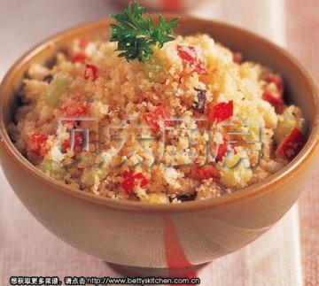 将干香菇泡发,洗干净后切成碎粒。红辣椒去子,洗净后切成与香菇一样大小的碎粒。西兰花杆切成0.5厘米见方的小丁。