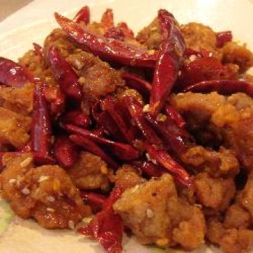 2.大炒锅置中火上,将油热至8成热下姜和鸡肉翻炸;改中小火,直到肉熟透并发硬,下干辣椒和花椒;依然保持小火;将全部的辣味和麻味都炸出来。出锅前味精调味。用漏勺捞沥干油装盘即成。