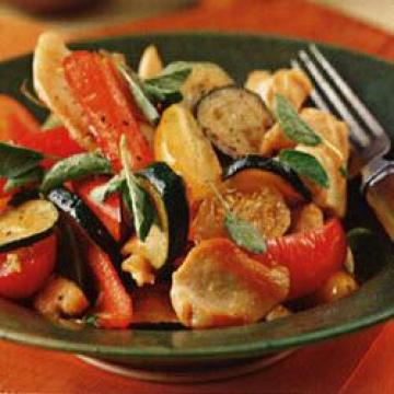 橄榄油2汤匙,无骨去皮鸡脯肉450克,切条(1.5厘米宽),盐1/2茶匙,黑胡椒粉1/4茶匙,红色、绿色或黄色甜椒11/2个,去籽切条,笋瓜(节瓜、翠玉瓜)1根,切片,大蒜2瓣,切末,小西红柿1个,对半切开,干奥勒冈(oregano)1/2茶匙,压碎,意大利陈年果醋(balsamicvinegar)2茶匙