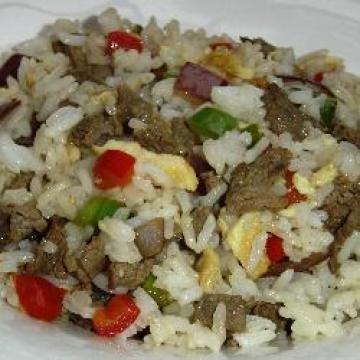 2.炒锅热油,放入蛋液炒散盛起,余油继续烧热,放入洋葱丁炒香,再加入牛肉、辣椒丁、酱油、盐炒入味;最后加入白饭翻炒均匀即成。