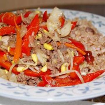 蔬菜油30毫升,大蒜4头,牛肉末225克,小卷心菜半个,红灯笼椒1个,酱油30毫升,玉米淀粉3克,水120毫升,黑胡椒粉2克