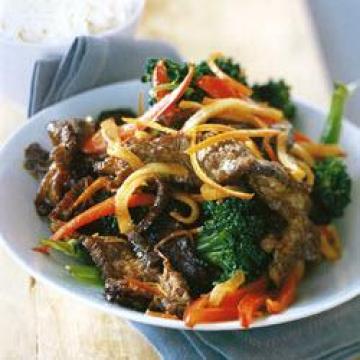 腹胁牛排340克,太白粉(粟粉)2茶匙,干雪利酒60毫升,低钠酱油2汤匙,小苏打1/4茶匙,橄榄油4茶匙,橙皮丝4汤匙,红辣椒粉1/4茶匙,青花菜(西兰花)425克,红甜椒1个,切条,青葱4根,切丝,大蒜3瓣,剁碎,地瓜170克,切条