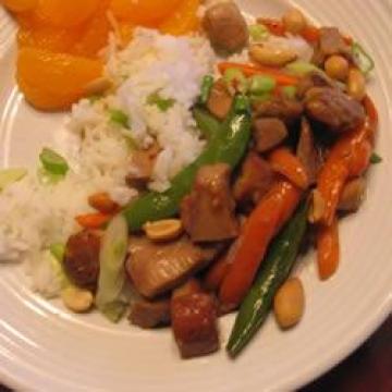 酱油30毫升,玉米淀粉8克,水15毫升,猪里脊肉450克,切成丁,青柠1个,榨汁,酱油15毫升,米醋30毫升,玉米淀粉3克,芝麻油15毫升,花生油15毫升,新鲜生姜末5克,绿椒2个,切碎,胡萝卜丝60克,甜扁豆丝90克,辣椒油10毫升,切碎的葱25克,碎花生35克
