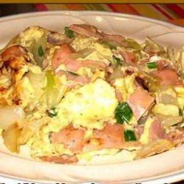 2.快火下3-4汤匙油,炒香洋葱;洋葱软身就加火腿略炒。转中快火,倒入蛋浆,当一面成形,加葱花就翻另一面。另一面煎硬就可以装盘。