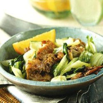 3.注入剩余的1汤匙油,放入姜末和蒜末,煸炒15秒。再将腌好的猪肉和酱汁一起下锅,拌炒3至4分钟,至猪肉烧熟。放入青江菜和剩余的雪莉酒,热透后盛盘,趁热上桌。