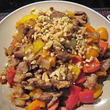 枚头猪肉450克,切丝,中洋葱1个,去衣,切丁,干红葱1棵,去衣,切片,蒜头2瓣,去衣,拍碎,红、黄、橙椒各半个,切丝,花生适量,烘烤过,压碎,以下分量只作参考,牛头牌沙茶酱45克,蚝油4克,水15毫升,基本调料:,酱油、生粉、糖、盐、水和油适量