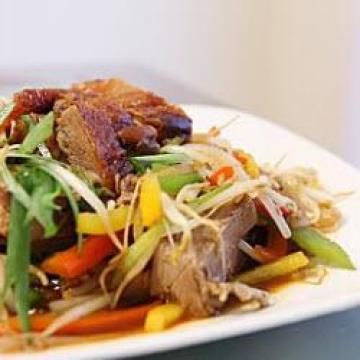 2.大火下油(约1汤匙)起锅, 先放蒜茸炒至金黄, 加入青葱, 洋葱再加1/3茶匙盐炒至软身, 再加三色椒炒匀煮热, 再加烧鸭, 芽菜和汁料烧开, 上碟即成。