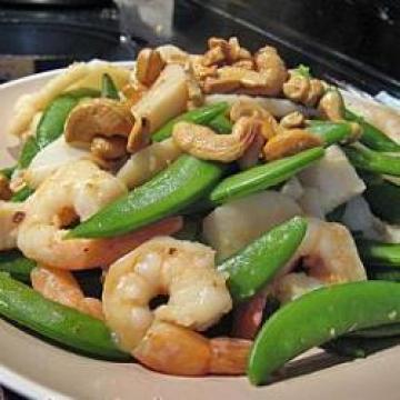 主材:,熟虾10只左右,解冻,鱿鱼筒1条,解冻,划花切片,大扇贝肉8粒,解冻,甜豆约500克,蒜蓉1汤匙,洋葱1个去皮切丝,红葱头1粒,切皮切碎,熟腰果适量,姜片2-3片,汁料:,生粉水适量,鸡粉1汤匙,水、盐适量,腌料:,蒜粉、麻油、盐、胡椒粉、生粉适量