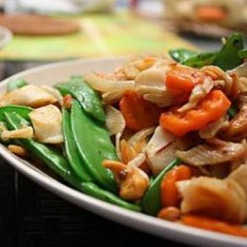 2.快火下油(约1汤匙)起锅,先爆香蒜茸至金黄,再加洋葱和1/3茶匙盐和辣椒油炒软,再加入虾粒,蟹柳炒匀,再加入荷兰豆、萝卜和汁料炒至收汁,加入腰果炒匀,装盘即成。