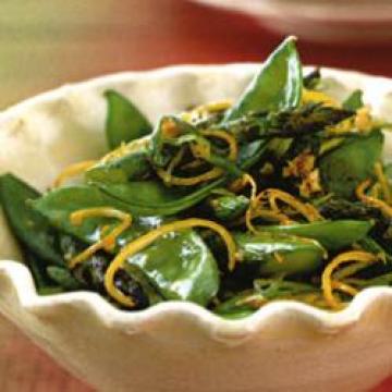 橄榄油1汤匙,芦笋450克,切掉粗茎,嫩茎部分削皮,斜切成2.5厘米长小段,留出5厘米长笋尖,荷兰豆(豌豆荚)115克,青葱4根,切丝,盐1/4茶匙,黑胡椒粉1/8茶匙,大蒜1瓣,切末,柠檬皮丝1茶匙,切碎的荷兰芹(洋香菜)2汤匙