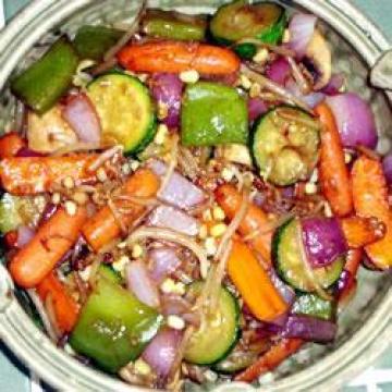 2.取一个大炒锅,置中偏大火上,放植物油预热。炒入胡萝卜,红柿椒和西胡瓜,约5分钟。炒入小玉米,大蒜,青葱和绿豆芽。倒入酱油混合液,搅匀。炒约5分钟,或直至蔬菜刚开始变软,但仍然是脆的。铲起,马上食用。