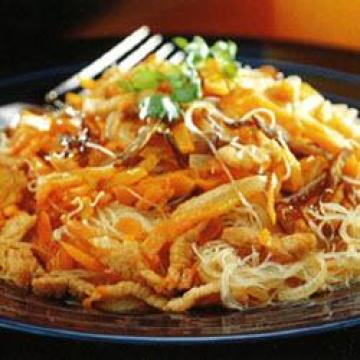 干米粉200克,冷水泡软,沥干,南瓜300克,去皮去籽瓤,切条,瘦猪肉150克,切丝,洋葱150克,切丝,木耳100克,摘净切丝,虾米2汤匙,酱油1汤匙,糖1/2茶匙,盐1/2茶匙,胡椒粉1/8茶匙,零脂肪蔬菜高汤360毫升,蔬菜油3汤匙,香菜(芫荽)10克(可选)