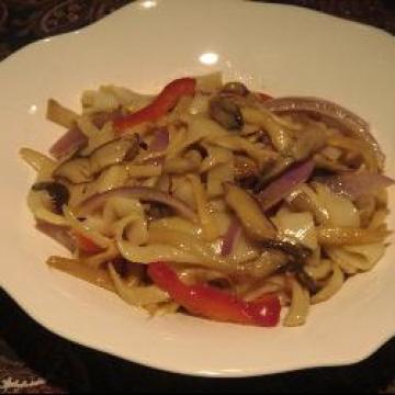 鸡腿菇100克,凤尾菇100克,盐1捏,白胡椒粉1捏,沙河粉300克,红洋葱50克,大蒜2瓣,红柿椒15克,菜油2汤匙,芝麻油1/8汤匙,酱油1汤匙