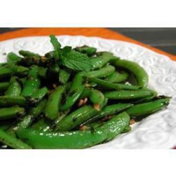 橄榄油2茶匙,甜豌豆角350克,葱3条,大蒜1瓣,盐1/8茶匙,胡椒粉1/8茶匙,新鲜薄荷叶1汤匙
