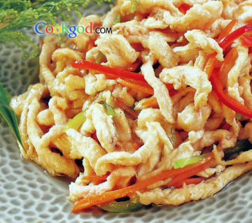 1. 鸡丝一定是温油(油温90度左右,不超过100度)入锅,入锅后可离火迅速滑开,变色即可出锅,入锅油温过高很容易柴老.同理,其他的肉丝也差不多.