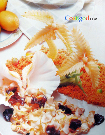 1、将海螺去壳去除黏液留黄,片成薄片,焯水捞出。