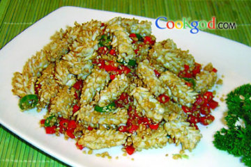 2、热锅入色拉油,下米椒与葱花爆香,放入原料拌炒均匀,加入调料翻炒,水淀粉勾薄芡,淋明油出锅即可。