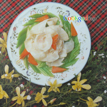 2、起镬放生油25克,放滚水,下精盐5克,放入西芹灼至仅熟,倒在疏壳里沥清水。将镬洗净,烧镬落油至120℃,将螺片拉油至七成熟,倒在笊篱里,利用镬中余油放料头、西芹、螺片,烹绍酒,调入碗芡,加尾油炒匀至熟上碟便成。