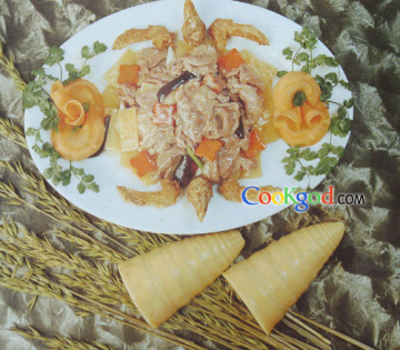 3、利用镬中余油,把料头、笋片放在镬中炒匀,加入鸽片,烹入绍酒,用芡汤、湿淀粉、胡椒粉调匀为芡,加上包尾油炒匀上碟,将鸽头放在面上便成。