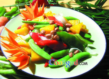 2、锅内放入花生油,烧至七成热时放入甜蜜豆、南瓜、百合、湖南酸菜大火翻炒10秒,用盐、味精、白糖、鸡精调味,撒花生、青椒片、红椒片点缀上桌。