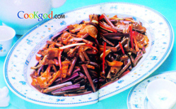 3、锅留底油,下干椒粉煸香,下蕨菜、红椒丝略炒,加味精、盐、酱油、白糖调味,下鸡肠炒匀,淋香油,撒葱段即成。