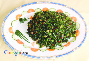 3、净锅置旺火上,锅内入底油烧六成热,放蒜末、肉泥、干椒粉爆香后,倒入黄瓜皮丁,一起煸炒后调味即可。