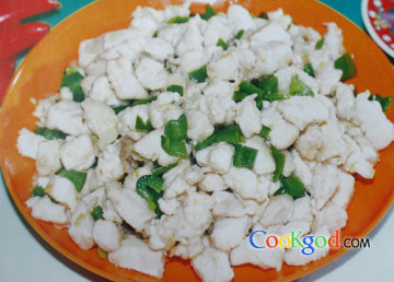 嫩鸡肉300克,青辣椒75克,香葱、姜各10克,蛋清1个,料酒15克,精盐、鸡精各3克,味精1克,白糖2克,淀粉、汤各25克,油60克。