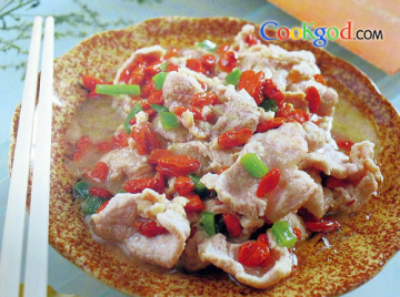 枸杞子50克,猪瘦肉250克,黄酒、白糖、酱油、植物油、精盐、湿淀粉各适量。