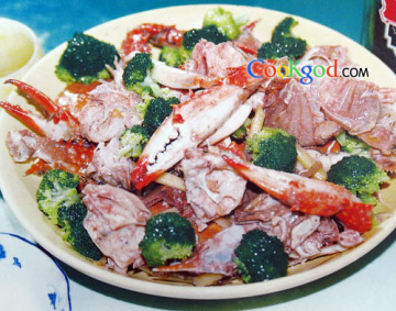 4、下入蟹块炒匀,烹入用全部调料对成的芡汁。翻匀、出锅装盘即成。