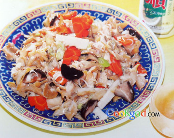 4、快速倒入氽好的螺片翻匀,盛入雀巢内即成。