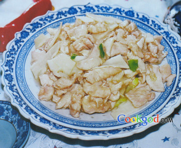 4、锅内放猪油50克烧热,下入葱段爆香,下入鸡片、笋片、烹入用余下的调料(不含猪油)对成的芡汁翻匀,出锅装盘即成。