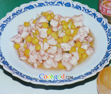 ③原锅内留猪油(25克),投葱段入锅,随即烹黄酒,加汤、盐、味精、鸡丁翻炒几下,用水、生豆粉勾茨,搅匀后淋上麻油,再翻炒几下,起锅装盘即成。
