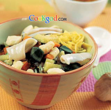1. 将虾仁、新鲜干贝、花枝切丁,再以沸水汆烫后随即捞起沥干;将蛋皮、海苔切成丝状备用。