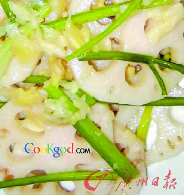 材料:莲藕500克、唐芹100克、蒜茸30克、姜茸20克,南乳、蚝油各少许,盐、糖、花生油各适量。