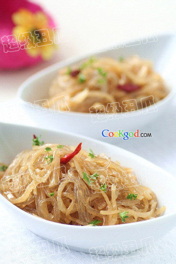 1)粉条洗净,用开水浸泡。泡软后,剪成10cm长的段,沥干水分备用。白萝卜去皮洗净后,切成细丝。