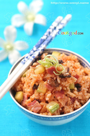 3)倒入米饭,用铲子炒散。与酱料炒匀后,加入奶酪,改成中火炒匀即可。