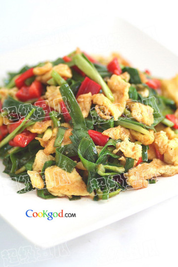4)炒锅倒入油,中火烧至7成热,锅离开火,此时倒入辣椒面,闻到香味后将锅放回火上,改大火放入韭菜,迅速翻炒几下,大约15秒钟后放入红椒。马上倒入调好的汁,翻炒均匀后立即关火,加入炒好的鸡蛋,翻拌均匀即可。