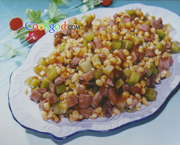 熟玉米(米查)饭300克,猪腰子(治净)、莴笋(去皮)各100克,料酒、葱姜汁各15克,酱油8克,精盐、鸡精各3克,味精1克,胡椒粉0.5克,湿淀粉10克,汤25克,植物油20克。