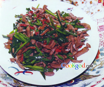 韭黄洗净,切段;猪腰洗净,切薄片。两味加油、盐共炒熟。