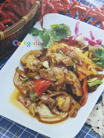 2、锅内注油烧热,加蒜片、辣酱爆香,放入猪头肉、笋片、青红椒煸炒,加调料,淋红油即可。